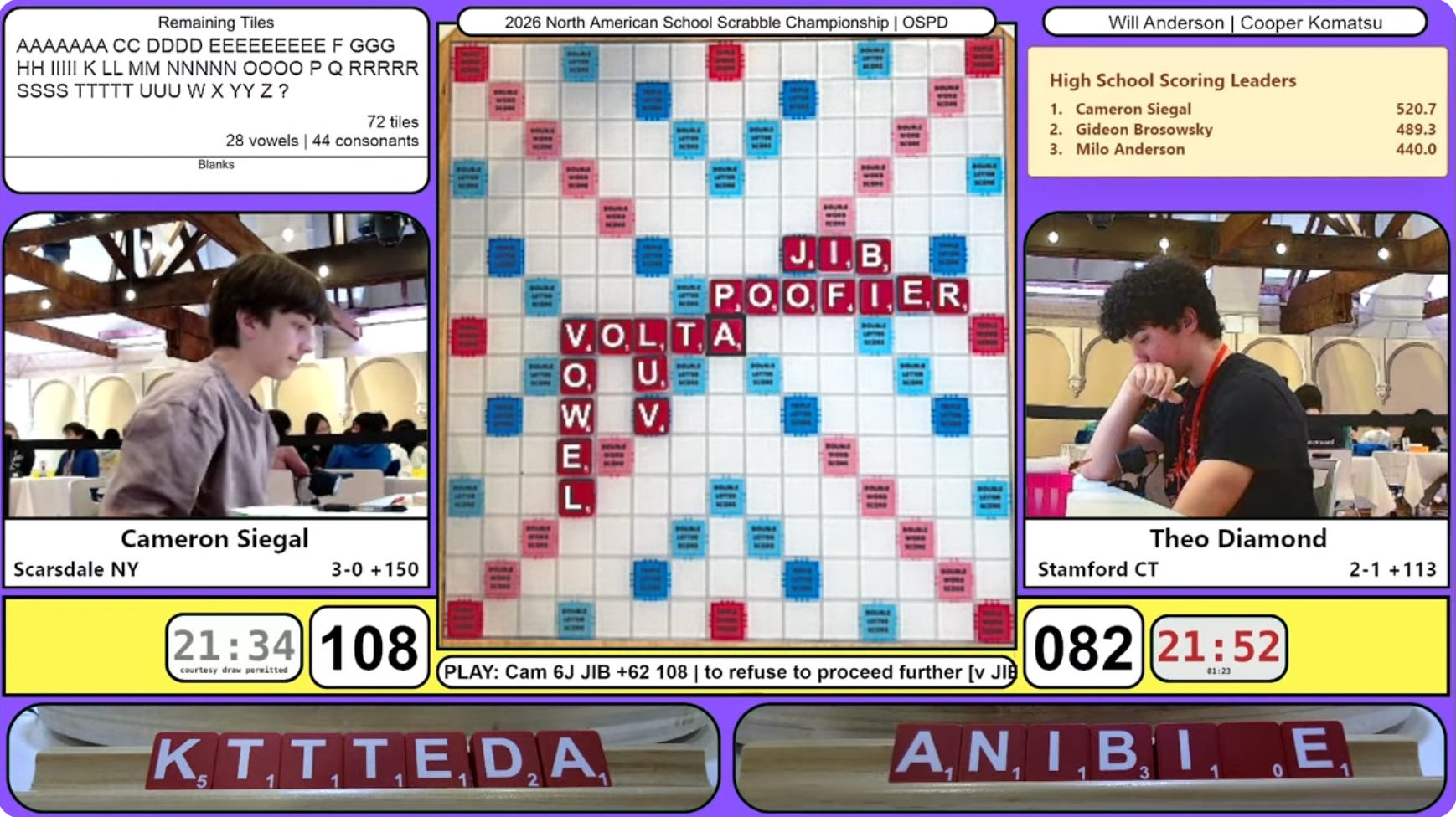 Cam put the play on “hold” while deciding whether to challenge. “Cameron is thinking something is up with this word,” Cooper said. Will mentioned my JAKER story. “We’ve got these little nuances that can really decide games,” he said. But Cam had a 62-point response, JIB atop the middle three letters of Theo’s bingo, so he let the play stand. “Clearly, Cam was dubious of this word but he wasn’t so sure of it to turn down this giant J play,” Will said. Also, Cam didn’t have anywhere else to score meaningfully, so he took the swap of high scores and moved on.