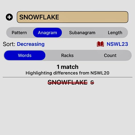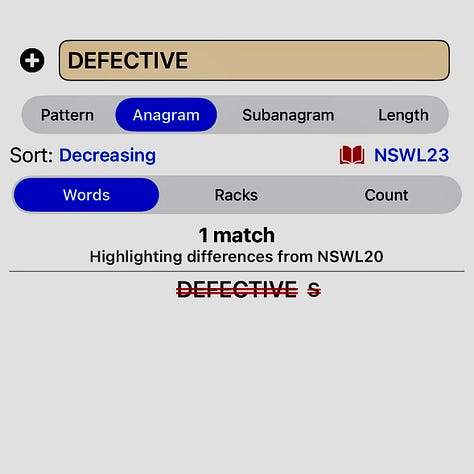 What happened? Merriam-Webster likely gave NASPA the expurgated Scrabble Word Finder list but NASPA failed to crosscheck it against its 2020 school list. I discovered the discrepancies after asking ULU’s creator, Scrabble expert and retired Google software engineer Seth Lipkin, to run a side-by-side comparison. It’s an understandable oversight, but also a little bit lol. Bottom line: As I wrote last week, the state of Scrabble’s word lists is a collective shitshow.