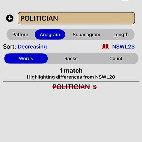 That was a dig at the Scrabble Word Finder on Merriam-Webster’s website. Sometime after 2020, Merriam appears to have flagged words in the online lookup with labels like “offensive” and “disparaging.” And then deleted them. A couple dozen common words with secondary or tertiary offensive senses were caught in the net. VEGETABLE was one of them, because of the second subsense of its third sense (“informal + sometimes offensive : a person whose mental and physical functioning is severely impaired and especially one who requires supportive measures [such as mechanical ventilation] to survive.”) Others included UNCIVILIZED (“old-fashioned + often offensive : not having the kinds of social systems, technologies, etc. that are seen in most modern societies”); SNOWFLAKE (“informal + usually disparaging someone regarded or treated as unique or special” and “someone who is overly sensitive”; PRIMITIVE (“dated, sometimes offensive : a member of a people that is nonindustrial, often tribal, and often without a written language” and “disparaging + often offensive : an unsophisticated person”); DEFECTIVE (“dated, now offensive : having a physical or mental impairment); and POLITICIAN (“often disparaging : a person primarily interested in political office for selfish or other narrow usually short-sighted reasons”). Type the last one into the Scrabble Word Finder search bar and you’ll be told: “POLITICIAN is not a playable word.”