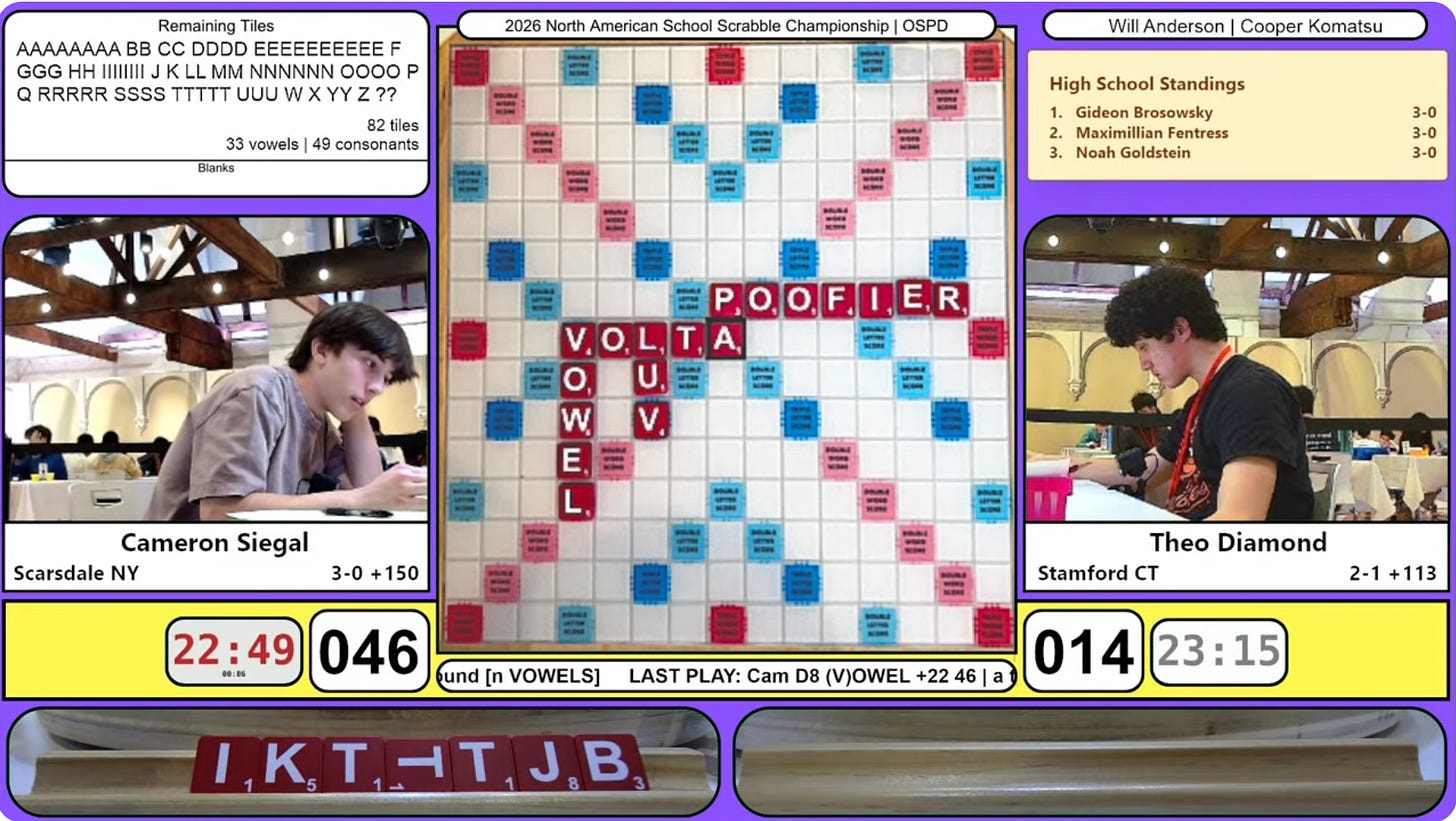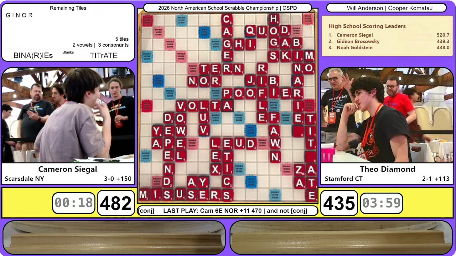 Will Anderson was commentating on the tournament livestream (the game starts at the 4:46:15 mark) with Cooper Komatsu, who in 2016 doubled as a School Scrabble champ and Scripps National Spelling Bee finalist. Will initially thought Theo had simply made a terrific play. Then doubt crept in.
