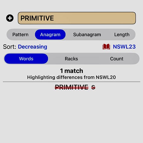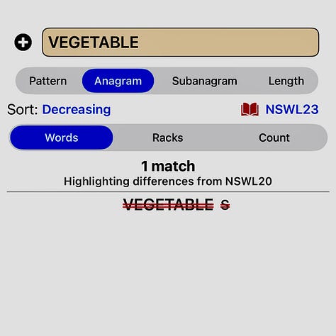 I checked the NASPA school list and guess what? The punch line VEGETABLE and others Merriam presumably unwittingly deleted from its lookup aren’t there. The Scrabble app ULU (an Inuit knife, but short here for Ultimate Lookup Utility) marks the words as having been on the NASPA school list in 2020 but removed in 2023.