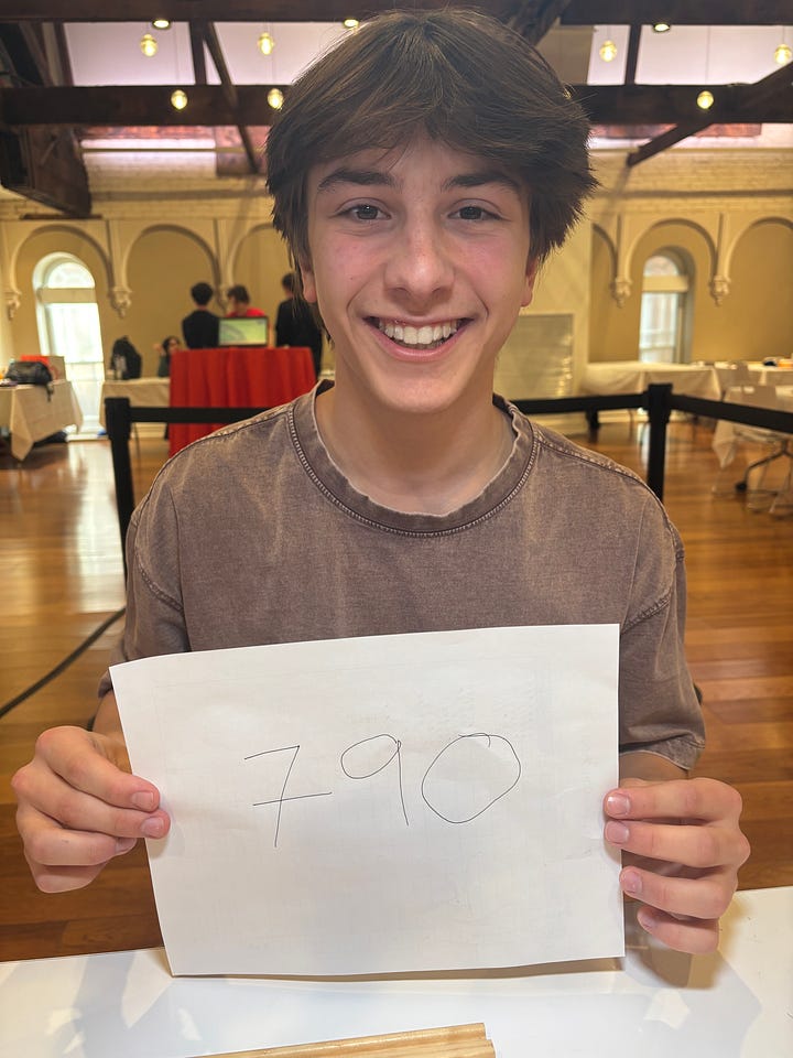 The high-school division was dominated by the two guys I featured in my story last week about Scrabble’s dictionary mess, 12th-grade besties Noah Goldstein and Cameron Siegal of Scarsdale, N.Y. Cam had the for-reals 790-pointer in Round 1, which I need to break down. After opening with QUID, Cam played JEWELER, turning QUID into EQUID (a family of mammals “consisting of the horses, asses, zebras, and extinct related animals”) for 133 points. That was a “double-double”—a word covering two double-word-score squares at once, for four times the value of the play. He proceeded to bingo, that is, use all seven tiles at once, for a 50-point bonus, four more times: ELODEAS for 78, VIOLATOR for 77, ANGARIES for 70, and BRoMATES, which has nothing to do with dudes, for 158. That was a “triple-triple”—a word covering two triple-word-score squares at once, for nine times the value of the play. Cam’s opponent was a novice who scored in single digits on nine of 19 turns, allowing Cam to draw the overwhelming majority of the tiles. But he found all of those obscure and creative plays, and the result stands as one of the highest scores in a sanctioned tournament ever. (Here’s a piece I wrote in 2006 about the 830-point game that remains the top individual score at a North American club or tournament. Three more years til it outlasts Bob Beamon’s long-jump record at the 1968 Olympics.)