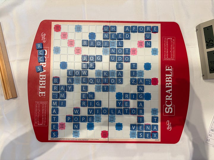 There were sick plays like bYROADS (lowercase denotes a blank), TAENIOID (a tapeworm; anagrams: IDEATION, IODINATE), and UNPLAYED through AYE already on the board; a 790-point game (see below); a slick, school-themed livestream anchored by former Scrabble champ Will Anderson; talks by Natan Last, author of the new book Across the Universe about crossword puzzles, and by me, author of the new book Unabridged about dictionaries; an officially rated side tournament for adults; and a packed session titled “How to Play Scrabble Like a Pro” cohosted by another former champ, Mack Meller. I helped organize and run the event. I’m still tired. Unc status confirmed.